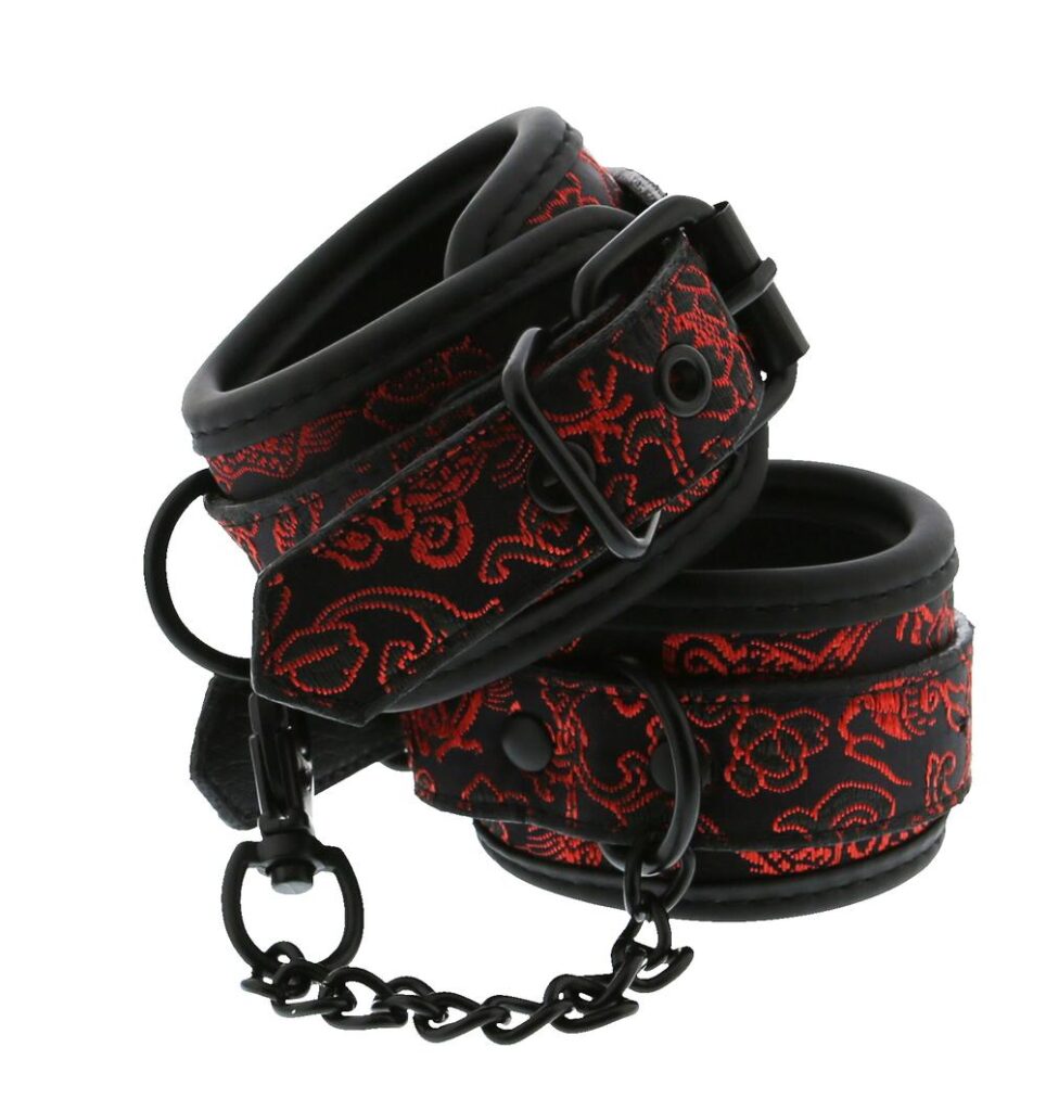 Pár stylových pout na zápěstí z řady Blaze, tentokrát zdobené černou textilí s červenou výšivkou. Jsou podšité měkkým neoprenem, který vám zajistí příjemné použití. Pouta jsou nastavitelná, aby dobře držela a nesklouzla z ruky ani při prudším pohybu. Jsou spojená řetízkem, který má na jedné straně karabinku. Díky tomu můžete řetízek prodloužit, kolem něčeho provléknout a připoutat tak dotyčného na určité místo – dle vašich erotických představ a fantazií.