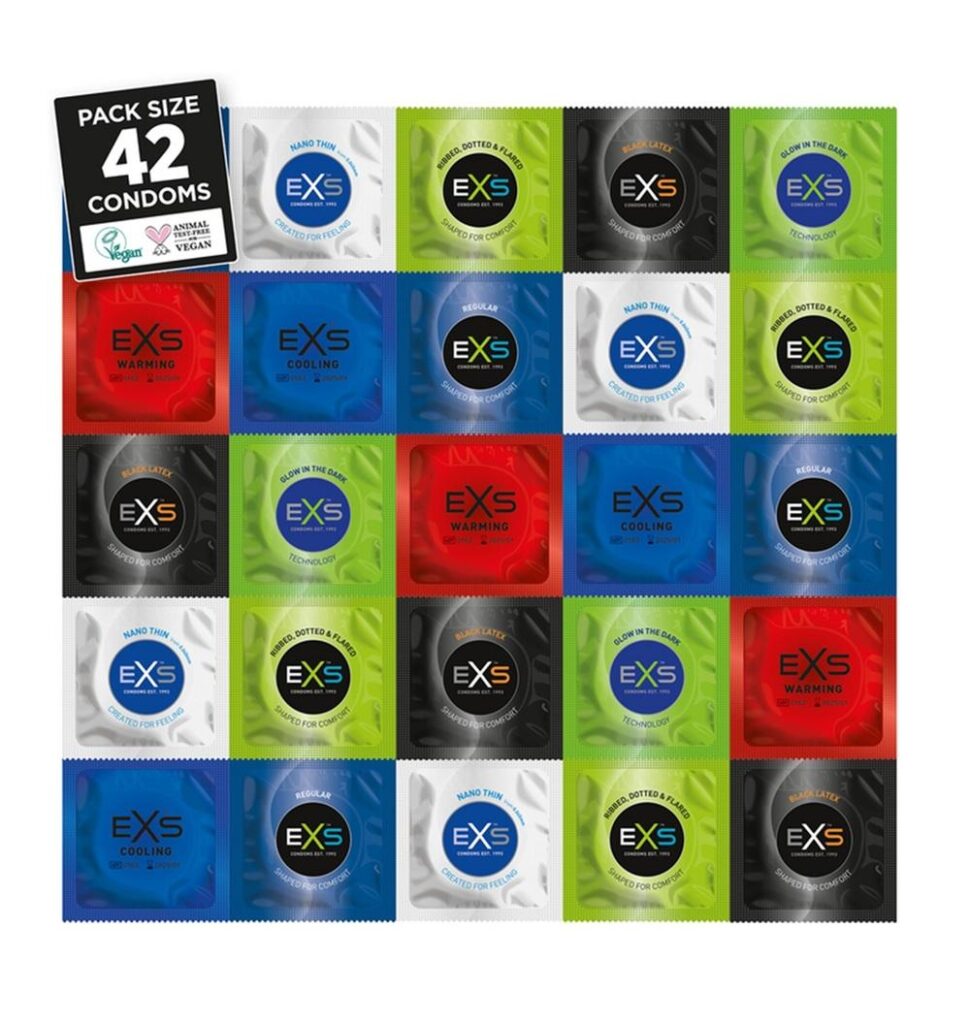 Obsahuje celou řadu 42 prémiových latexových kondomů EXS. Obyčejný, se speciální lubrikací, svítící, vroubkovaný nebo ultratenký? Výběr toho nejlepšího kondomu není zdaleka snadný, a proto přichází na řadu EXS Variety Pack kondomů!