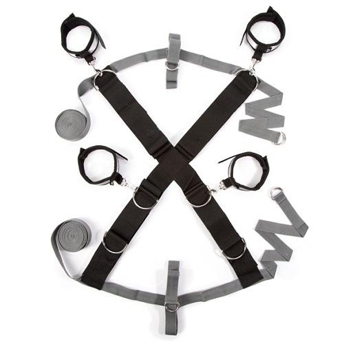 Systém poutacích pásů z oficiální kolekce Padesát odstínů šedi  důmyslně zpracovaných tak, aby se hodily k připoutání k jakékoliv posteli.