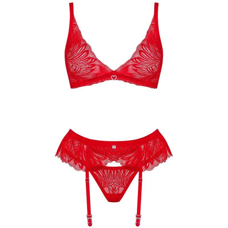 červený set spodního prádla se skládá z podprsenky, podvazkového pásu a tang