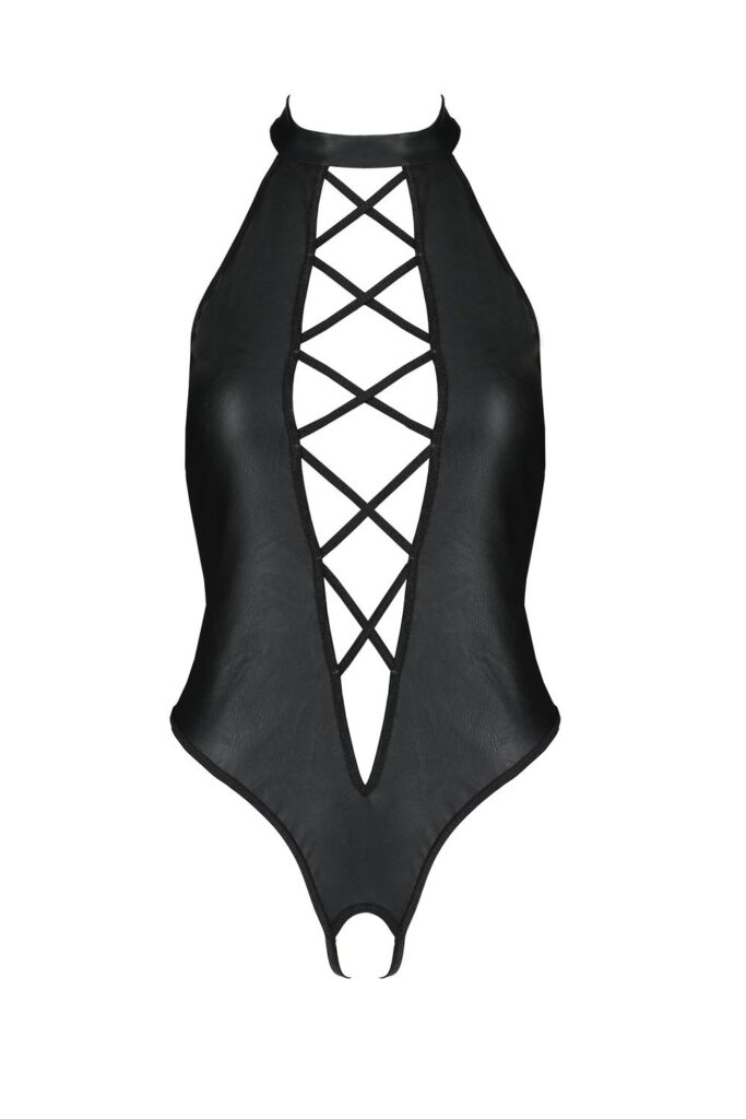 Černé body Nancy kombinuje špetku neslušnosti i jemnosti. To vše díky materiálu napodobujícímu kůži a hlubokému výstřihu, který perfektně sedí. Překřížené pásky jsou velmi sexy a evokují klasický korzet. Mohlo by to být smyslnější?